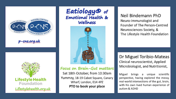 Eatiology® of Emotional Health & Wellness Focus on Brain-Gut matters with: Dr Miguel Toribio-Mateas Clinical neuroscientist, Applied Microbiologist, and Nutritionist, and Neil Bindemann PhD Neuro-immunologist and Founder of The Person-Centred Neurosciences Society, & The Lifestyle Health Foundation